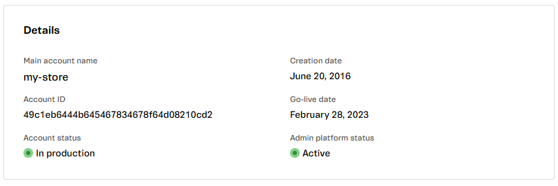 • Account status: Indicates whether your account is in production or not. An account in production is the first step to making your store available for customers in a public domain. This status can be either in production or not in production.