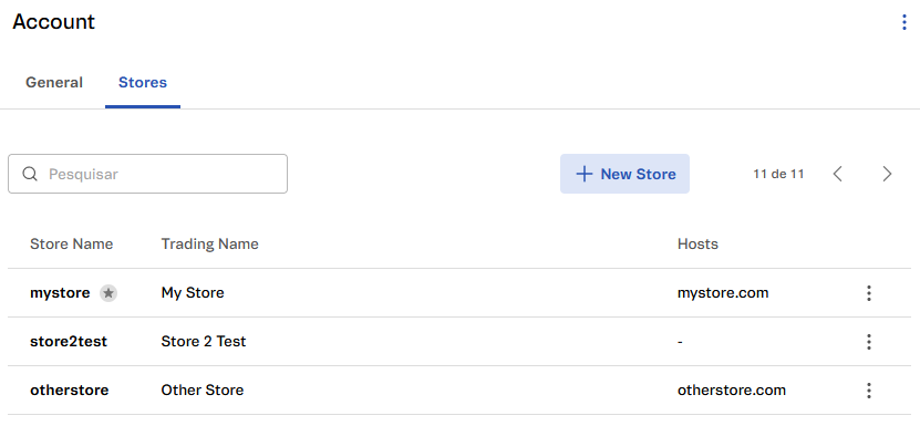 By clicking the Stores tab at the top of the screen, you will see a list with all the information of all the stores created in your VTEX account.