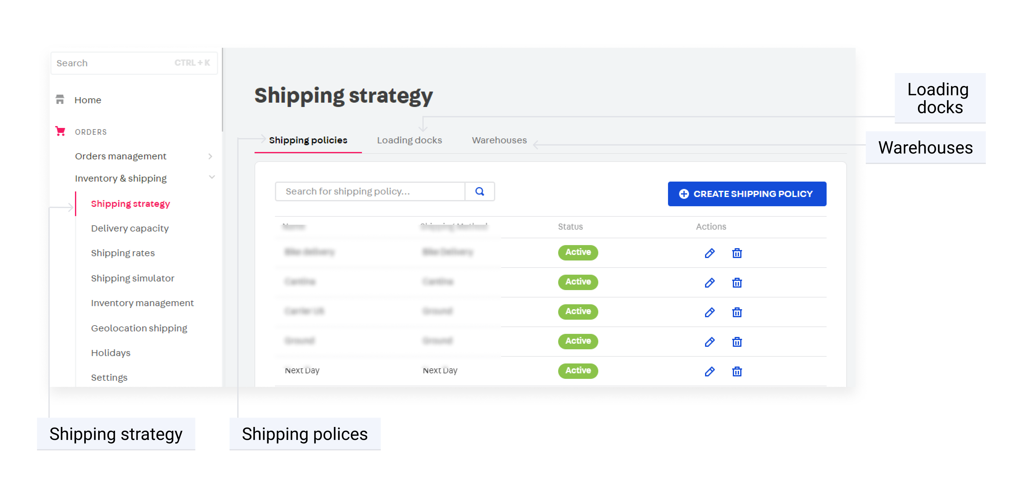 The shipping strategy defines how warehouses, loading docks, and shipping policies interact to meet the needs of your customers and your business.