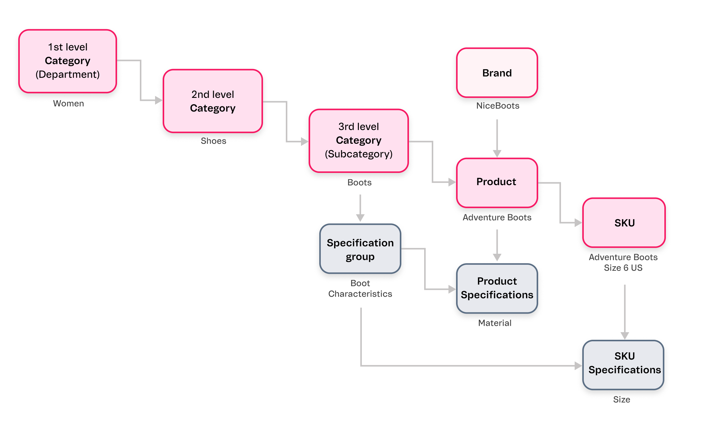 The Catalog architecture has some key concepts: category, brand, product, SKU (Stock Keeping Unit) and specification. The image below shows the relation between these concepts: