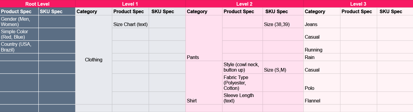 Before importing the store catalog to VTEX, we recommend that you start working on the category tree by creating a table such as the one below. This allows you to better view the tree's organization and the display of specifications.