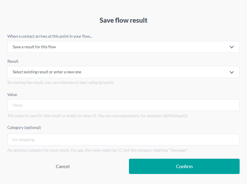 To fill in the contact fields, just use Update Contact. In it, you select the contact field you want to update, and after that you can enter a fixed value or a flow result. If the contact field does not yet exist, just write the name you want for it. To learn more about the contact fields, visit the contact article