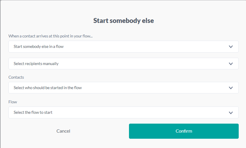 In the same way that we can send a message to a contact / group that is not the current one, we can also start a new flow. To decide who will be initiated by the flow, we can choose between three options: