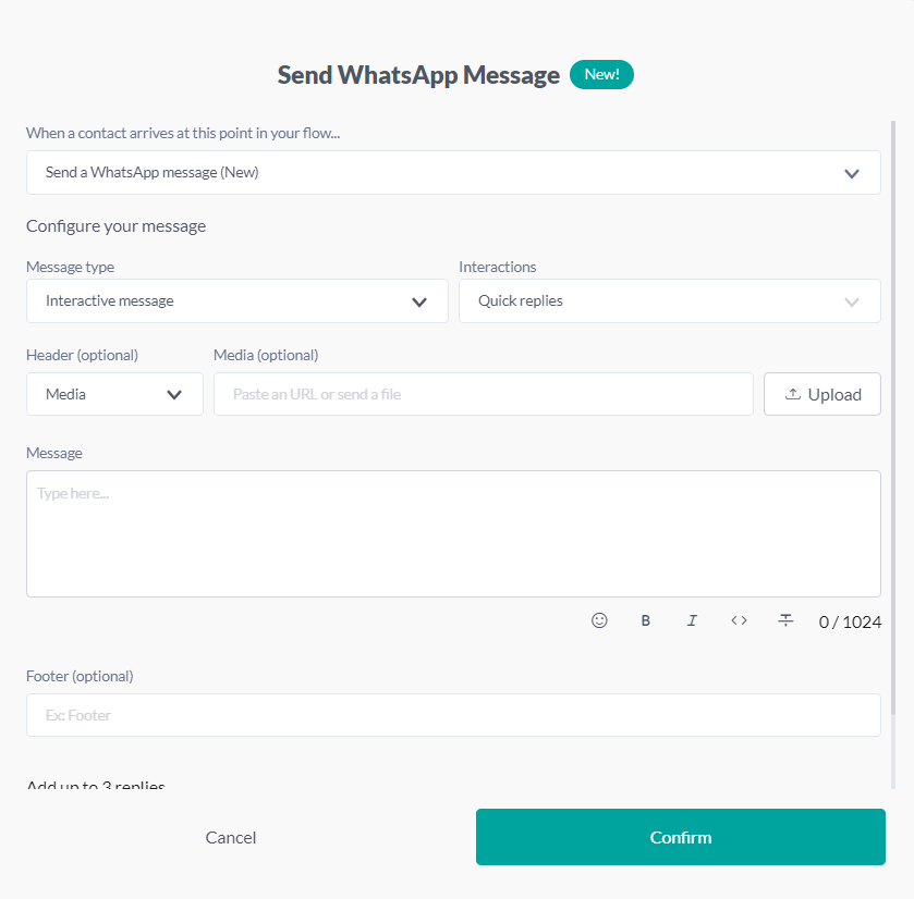 In addition to these interactions, you can include headers (with media or text) and footers in the messages. The availability of these elements depends on the type of interactive message chosen.