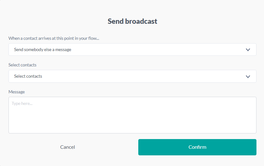 We can send a message to a contact or group other than the one running the flow. This message will be displayed to the contact / group without affecting any flow or conversation that may be currently running for them.