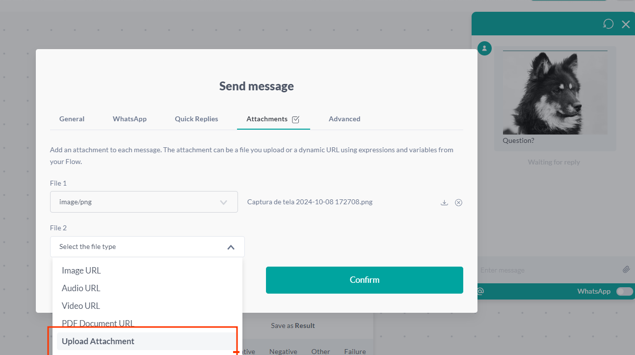 - Add a new action card, click on Files , and choose between Image URL , Audio URL , Video URL , PDF Document URL , or insert the chosen media URL.