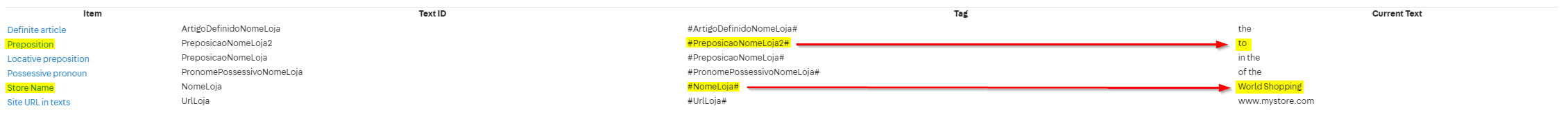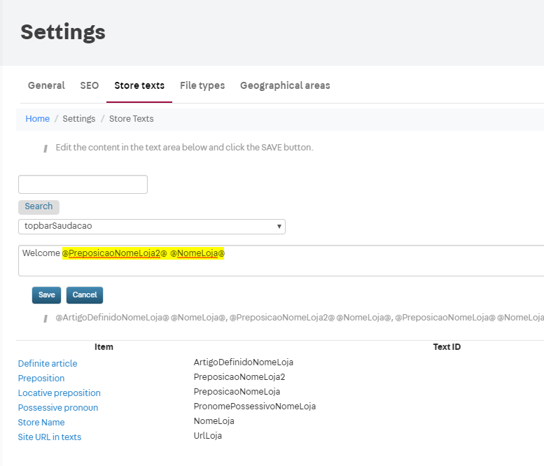 As I defined the content of the first variable to be "to" and the second one is "World Shopping", the final text rendered on the site will be "Welcome to World Shopping".
