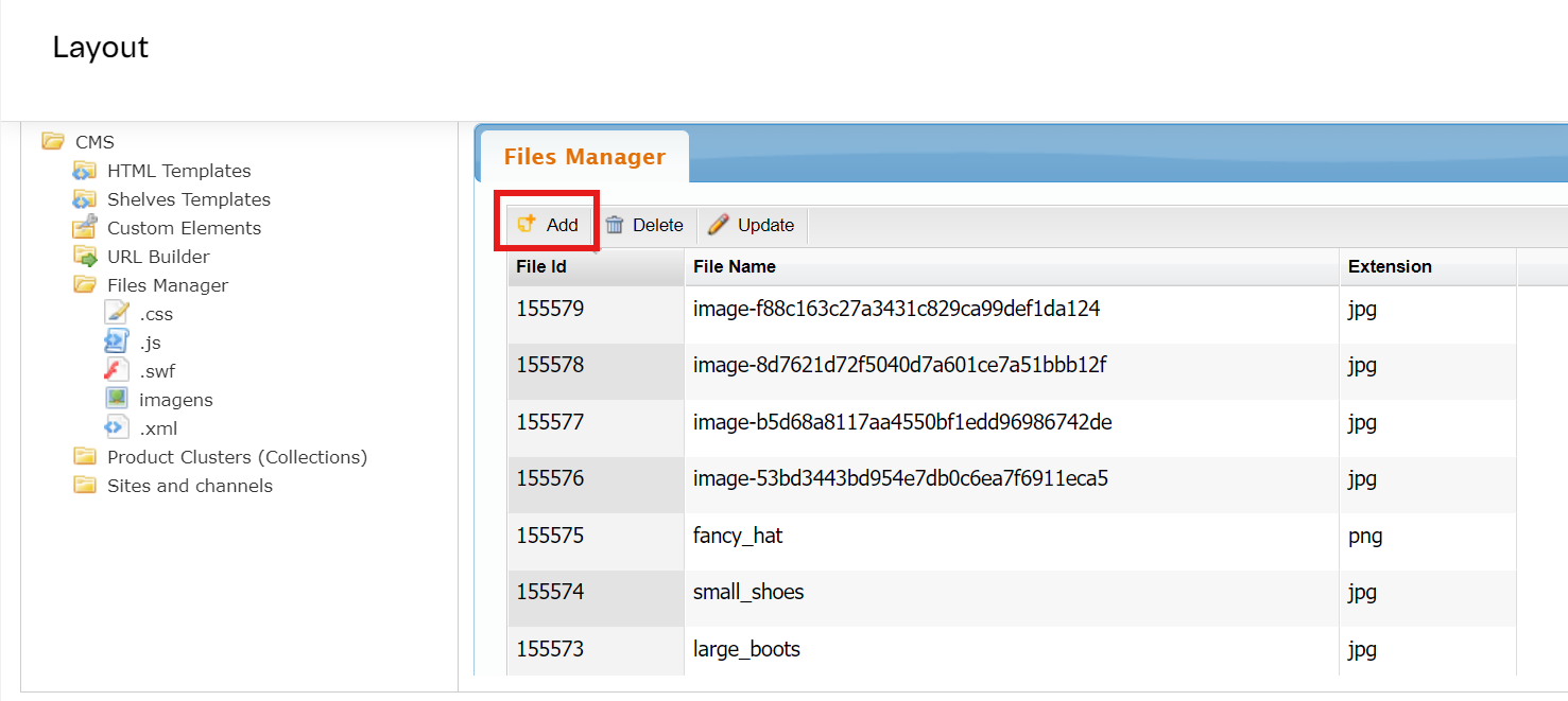 In the VTEX Admin, go to Storefront > Layout > CMS > Files Manager > images.