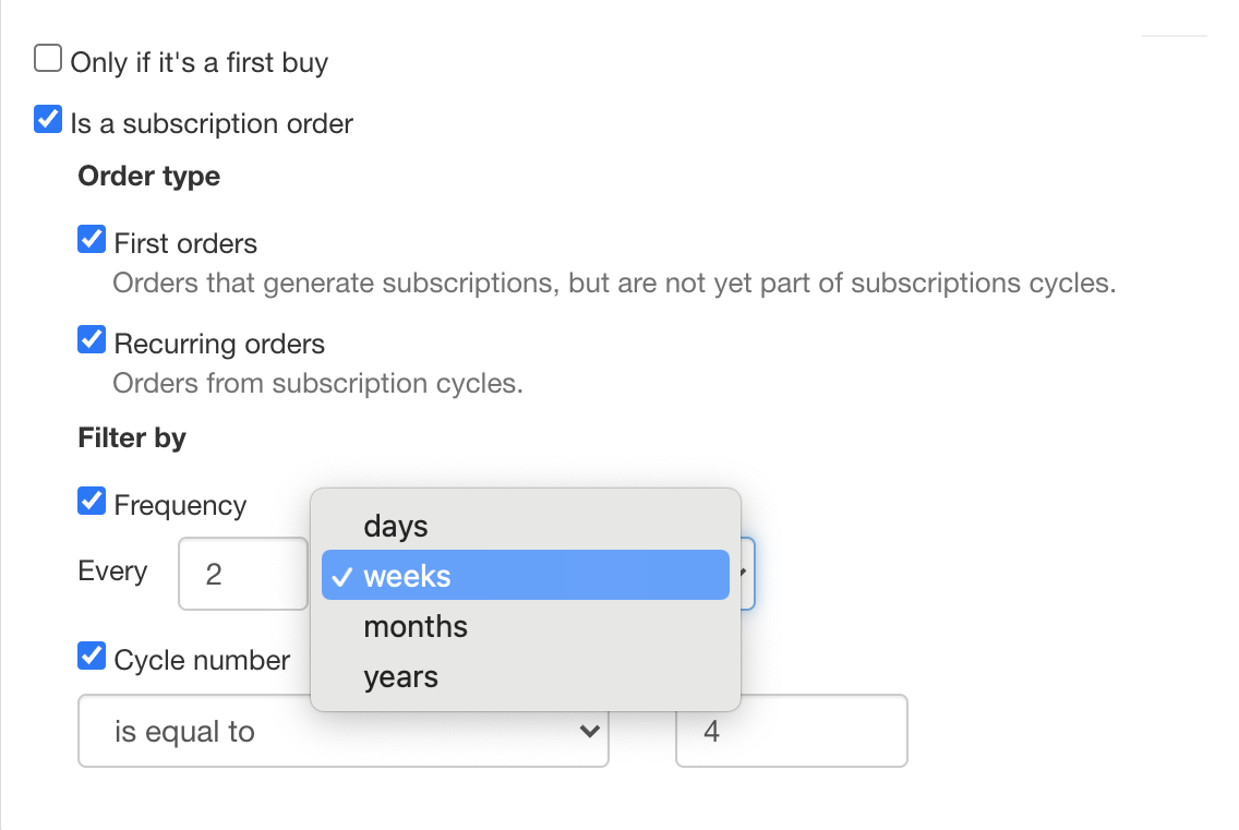 - Frequency: selection of the subscription order frequency valid for the promotion in days, weeks, months or years.