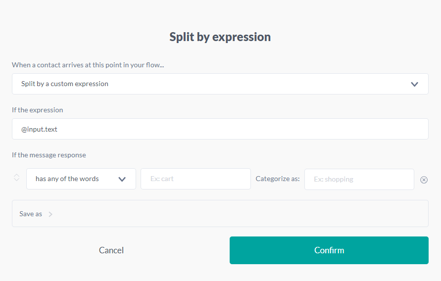 - has all of the words: If the answer / value has all the chosen words, it will follow the indicated route. All words must be separated by a space.
