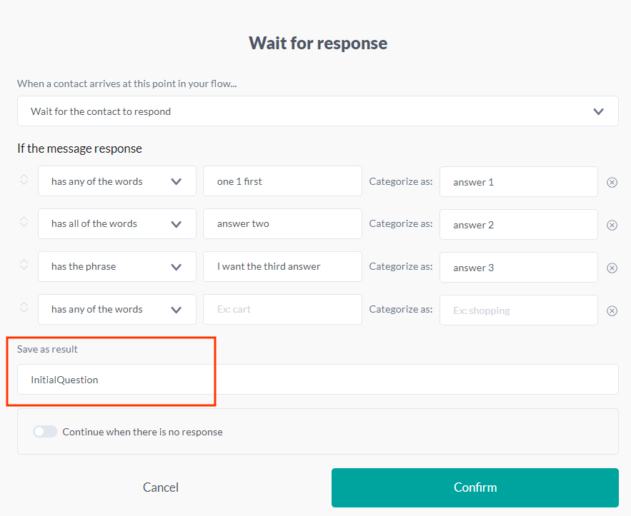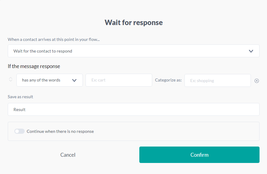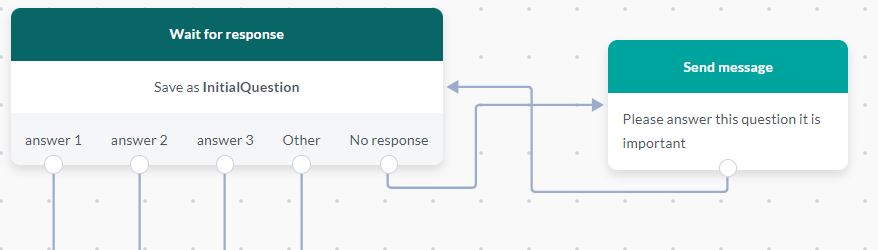 Advanced If you are using this card to collect mandatory information in the flow, be cautious when selecting the option ""continue when no response."" If the ""No response"" option is not connected to another card, the flow will end when the waiting time expires. If you want to remind the contact to respond, you can create a loop, which will prevent the contact from moving to the next card without providing an answer.