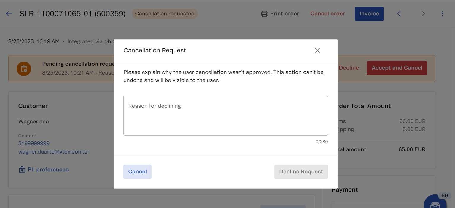 To decline an order cancellation request via the VTEX Admin, follow the steps below: