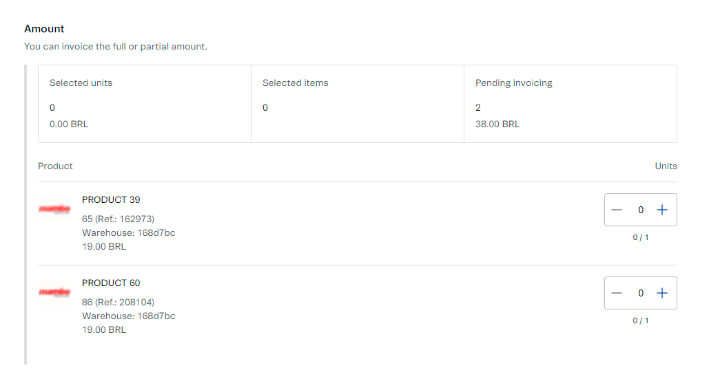 - **Submit invoice referencing items: **This option is exclusive to the new interface. It allows you to issue the invoice for all or specific items identified by SKU, inventory, and price. The following image shows an example: