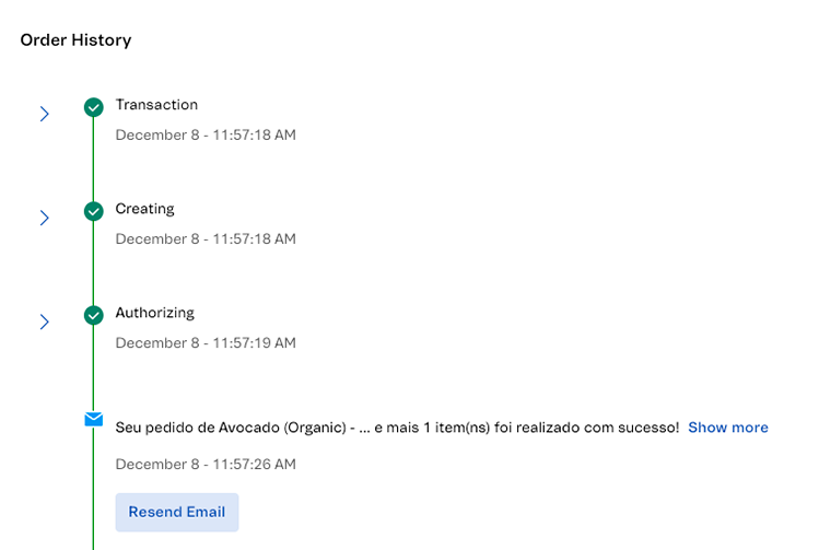 In the new interface, in the Order history section, there is a timeline with events related to the order, including sent emails, which are identified with the icon.