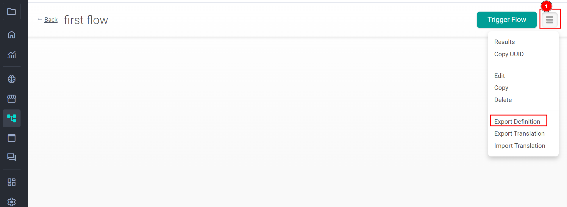 To access the export page through the flow editor, simply go to the options menu and click the ""Export Definition"" button.