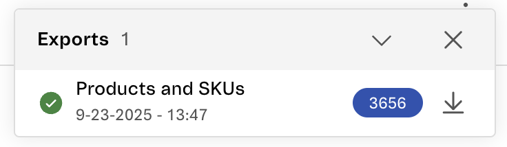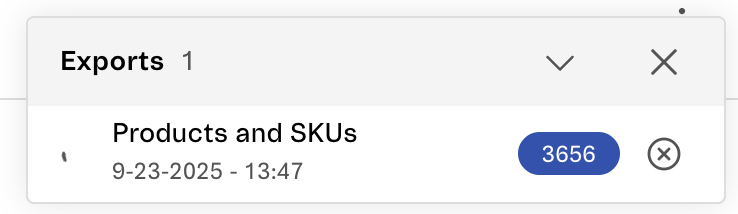 While the export is being processed, the Products and SKUs page will display a window at the bottom, as in the following image: