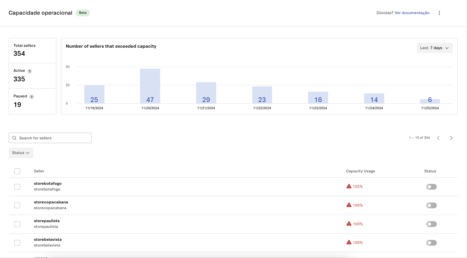 The Operational Capacity (Beta) page allows you to manage the sellers' capacity to receive and handle the store's orders to optimize your logistics network. You can monitor the order allocation between sellers and perform actions to improve order allocation between them.