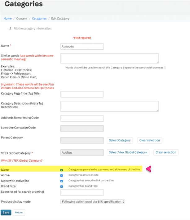 Important: The &lt;vtex.cmc:searchNavigator/&gt; control displays, by default, only the primary-level categories (root) and the lowest-level sub-categories, within the current context. Intermediate splits in the categories tree are omitted. In addition, the control only functions on the first three levels, which traditionally are the Department, Category and Subcategory. If your catalog architecture has any other subdivisions except the three levels mentioned above, these will not be displayed using the native control.