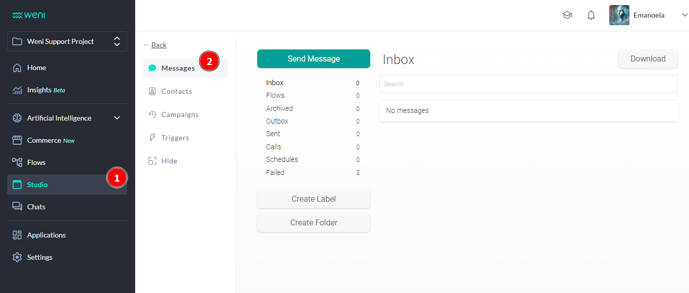 Within your project, go to the ""Studio"" tab and then click on ""Messages"" in the side menu.