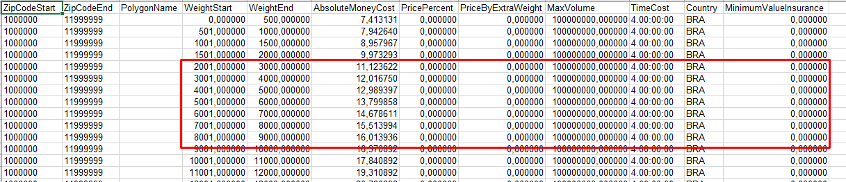 PolygonNameThe polygon identification defined in the geolocation function.To use geolocation, after filling in the PolygonName column with the desired values, fill in the ZipCodeStart and ZipCodeEnd columns with the value 0.