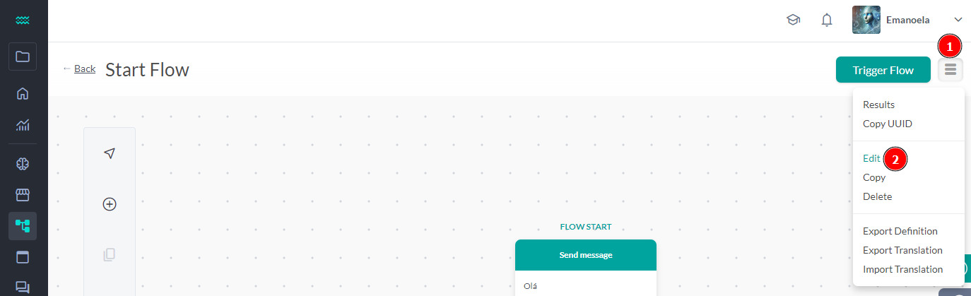 Click on the three-line icon in the upper right corner of the flow editor, and then click on the ""Edit"" option.