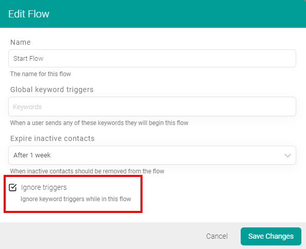 However, if you prefer to keep contacts in a flow until they complete it or until the flow expires, you can configure the system to ignore keywords while the contact is active in the first flow.