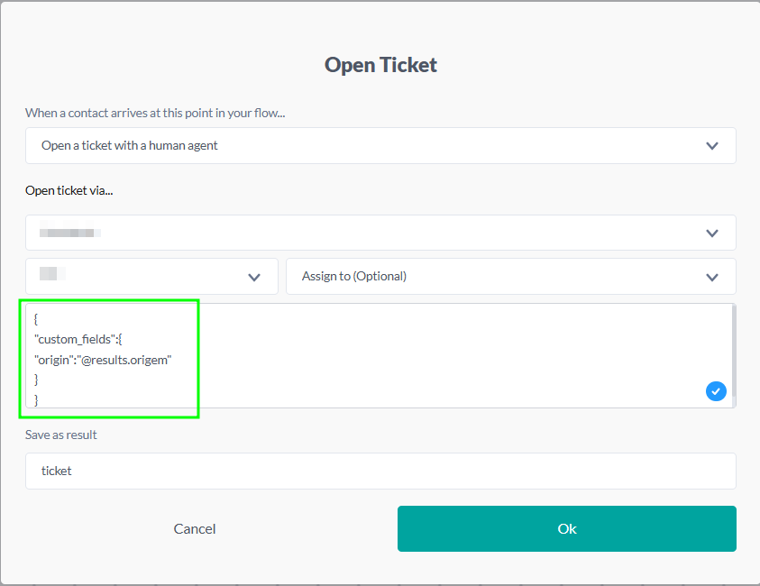 Below, observe an example showing the configuration of custom fields, where the origin field has its value defined as the result origin, enclosed in """" as it is a string type.