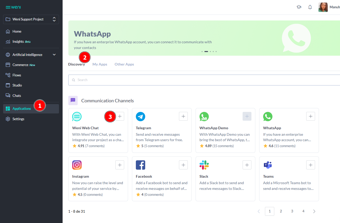 - In your project, click on Applications > Discoveries > Add the Weni Web Chat channel.