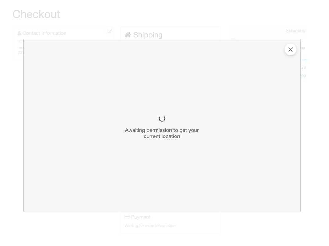 At checkout, if the customer's location is obtained from the browser, the map keeps loading indefinitely. It displays the message "Awaiting permission to get your current location".
