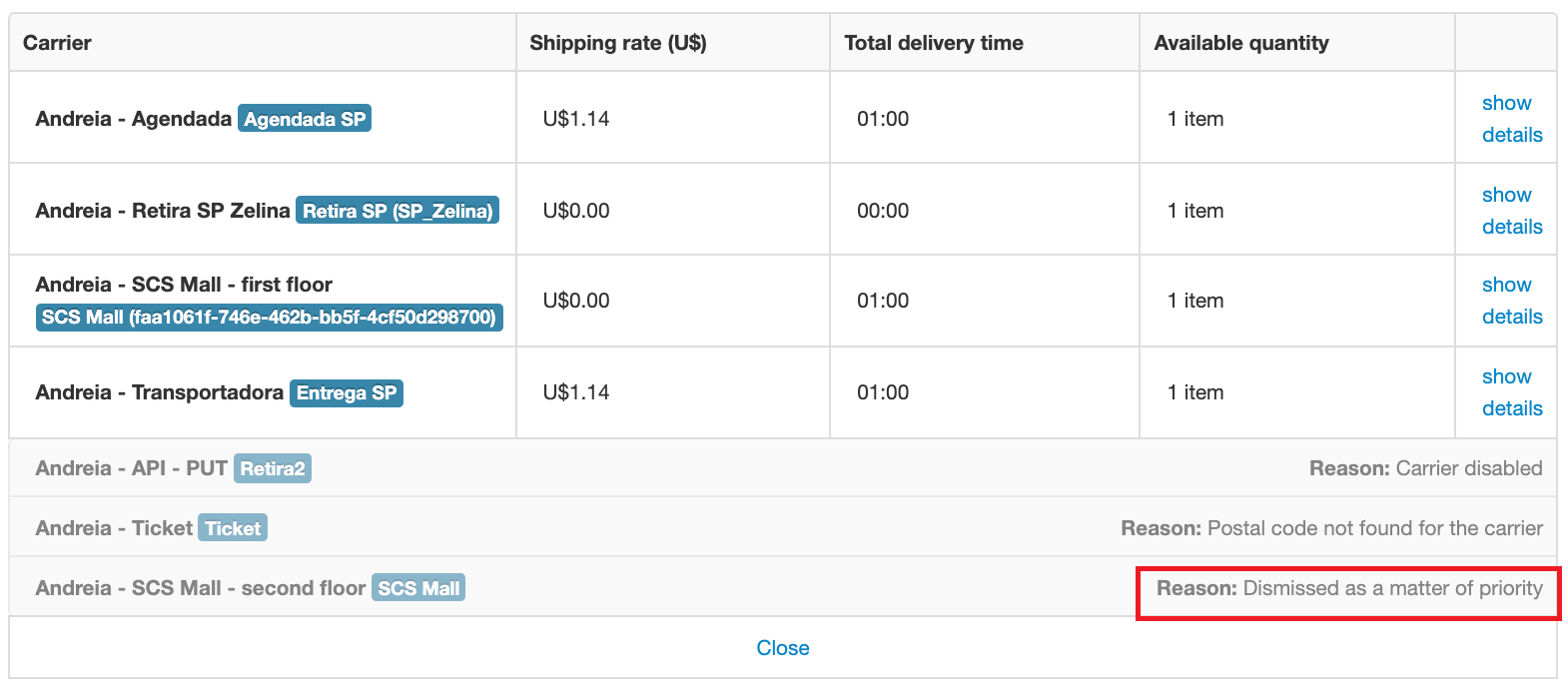 When simulating a delivery for which there are shipping methods with the same name for pickup points in different shipping policies, only one will be available. The other pickup points will be disregarded and will not be displayed by the interface, or will be displayed along with the message: Disregarded based on priority".
