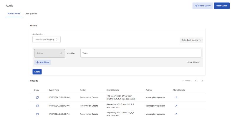 Audit allows you to query events using filters related to the following information: application, date, action, author, and event details. Below, we explain how to use Audit filters and how the results are displayed. We also use practical examples to demonstrate the use of filters.