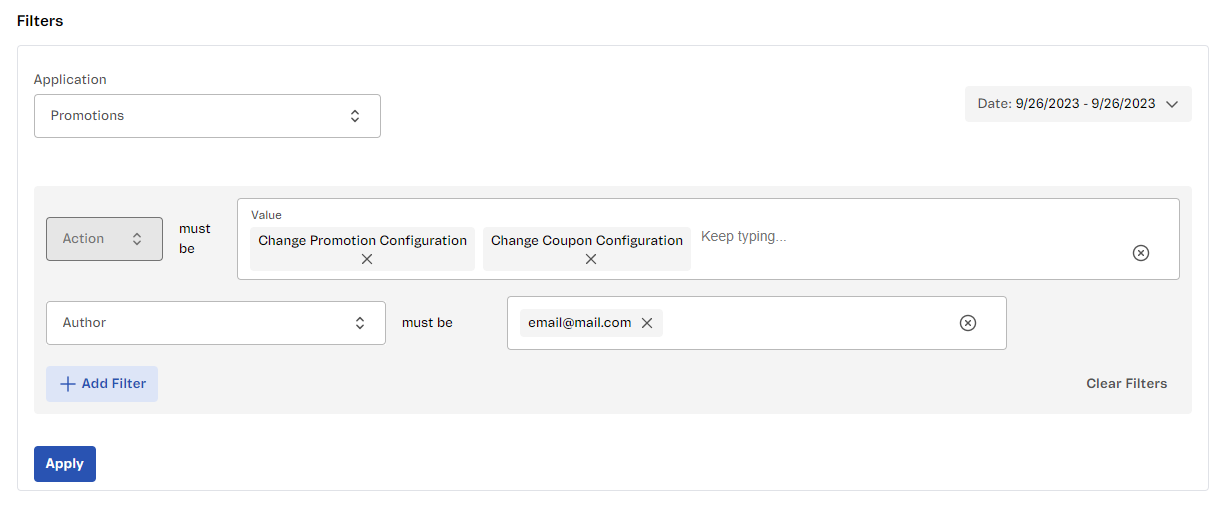 When adding filters with the same parameter (for example: Action = Change Promotion Configuration or Change Coupon Configuration), the results include events that match any of the values entered. When adding filters with different parameters (for example: Action = Change Coupon Configuration and Author = email@mail.com), the criteria are combined. Note that you can repeat steps 4 and 5 to add more filters.
