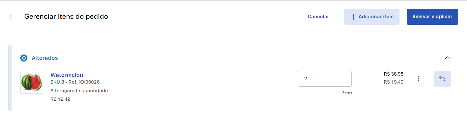 Na página Gerenciar itens do pedido, se você se arrepender de alguma alteração realizada, é possível desfazê-la. Para isso, clique no ícone seta curva Desfazer ação. Feito isso, uma mensagem de confirmação vai aparecer: “Alteração desfeita”, e a ação terá sido revertida.