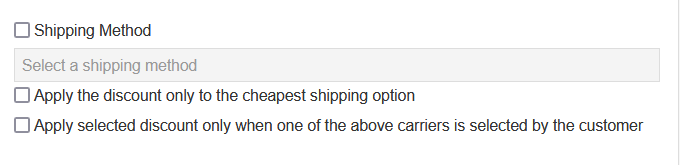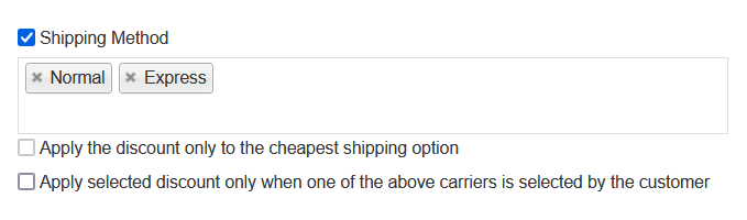 If you enable the options Shipping Method and Apply discount only when one of the above carriers is selected by the customer and select the shipping types you want, the shipping discount will be applied to all selected shipping types only when the customer chooses the shipping type at checkout.