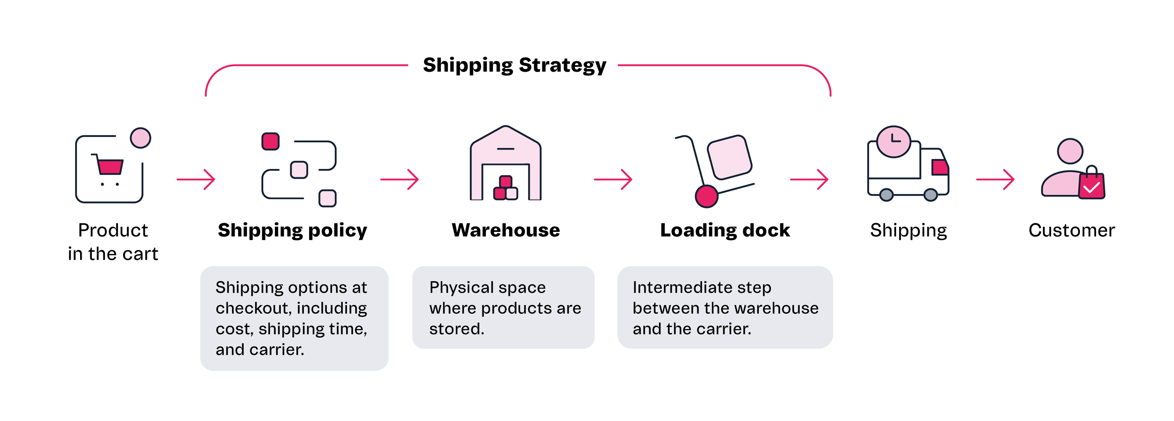 Shipping policy is a set of rules and settings that define the shipping options displayed to customers at checkout. The relationship between shipping policy, warehouse, and loading dock makes up your shipping strategy on VTEX, as shown in the image below: