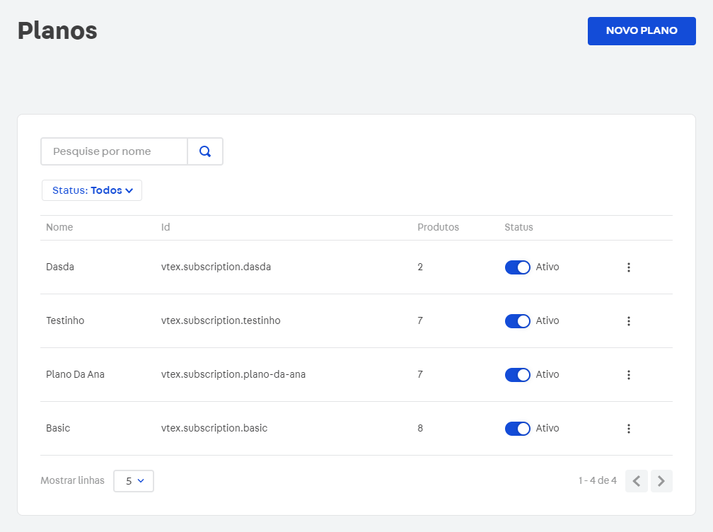 A página Planos do módulo de Assinaturas exibe a lista de todos os planos de assinaturas configurados na sua loja, sejam eles criados a partir da página Novo plano ou dos anexos de SKU.