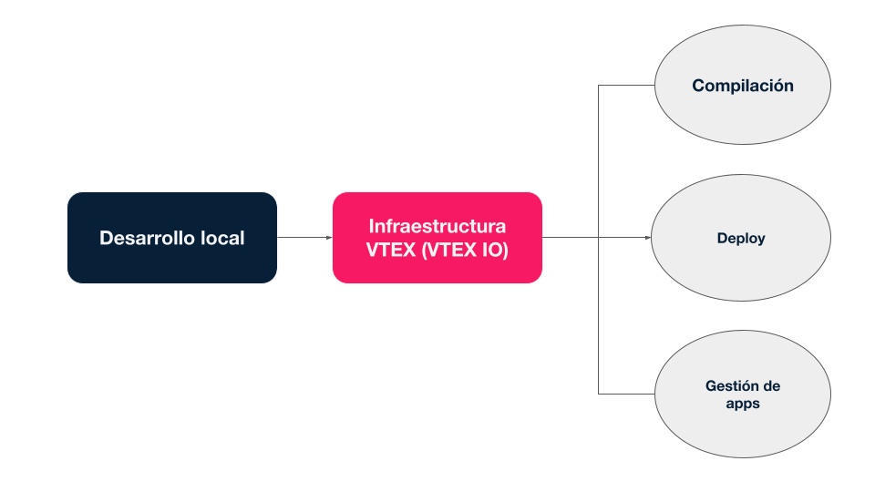 Esto significa que cuando trabajas con VTEX IO, desarrollas tu código localmente. Sin embargo, en lo que respecta a implementar y ejecutar la tienda, además de encargarse del proceso de deploy, VTEX IO gestiona la infraestructura, CI/CD y la seguridad. La siguiente imagen muestra cómo se relacionan estos conceptos entre sí: