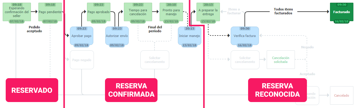 3. Finalmente, una vez que el pedido se encuentra en la etapa de preparación para la entrega, los artículos pasan al estado Reserva Reconocida. Este estado indica que el artículo ya no existe en el inventario físico.