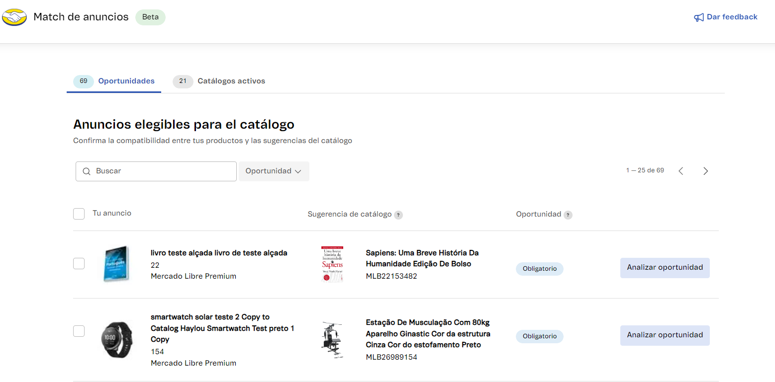 | Oportunidades | Una oportunidad es un producto del seller que se puede vincular a un producto del catálogo de Mercado Libre. El objetivo de la oportunidad es proporcionar al seller una herramienta que pueda realizar la asociación entre los productos. |