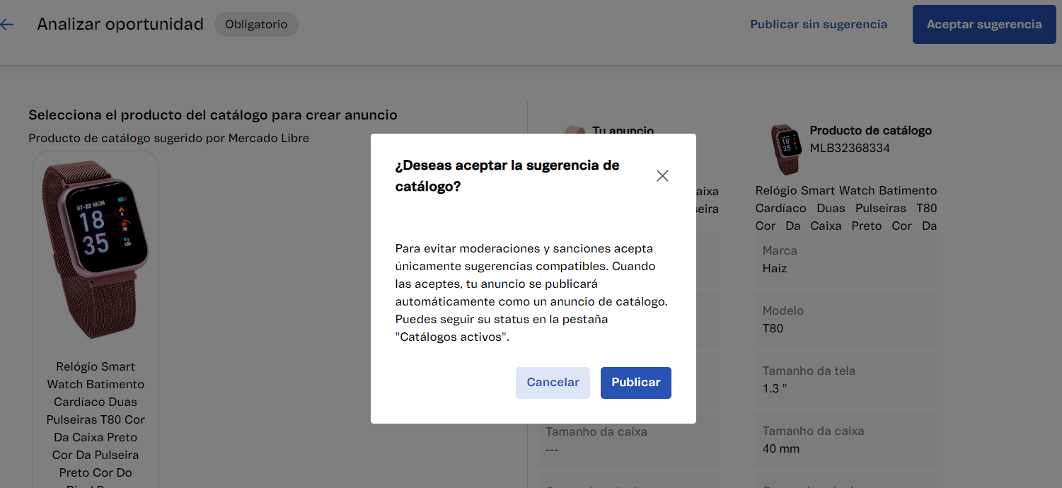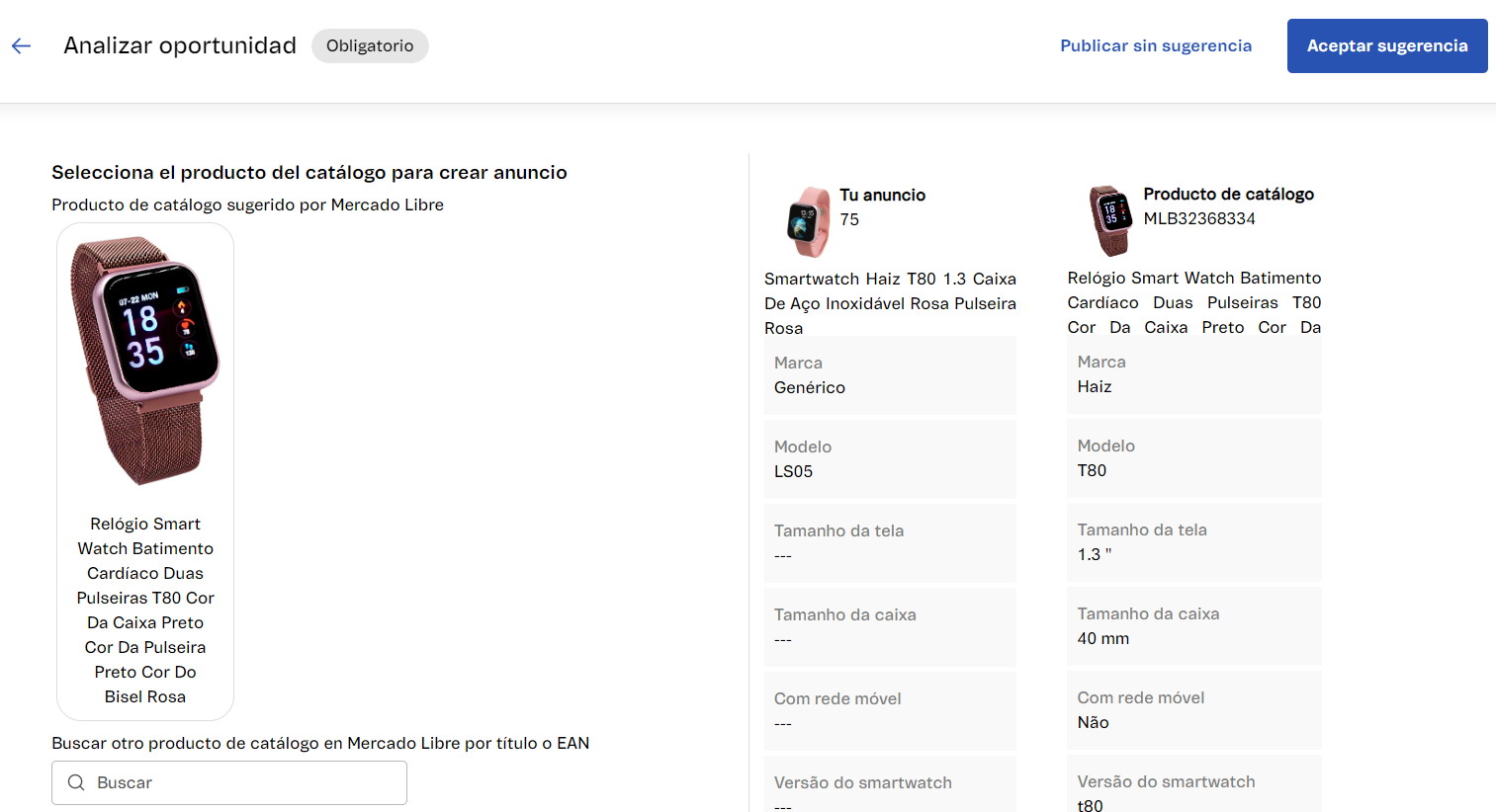 Analizar oportunidad. - Comprueba que los datos del anuncio sugerido por Mercado Libre sean compatibles con los datos de tu producto.