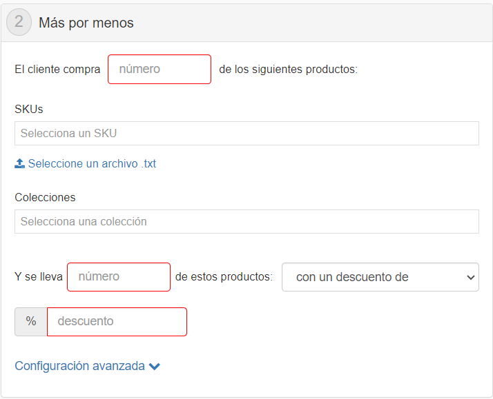 En la configuración de la promoción Más por Menos, la tienda debe definir a qué colecciones o SKUs se aplicará. Luego, elija el número de ítems en el carrito para que funcione y el número de ítems con descuento.
