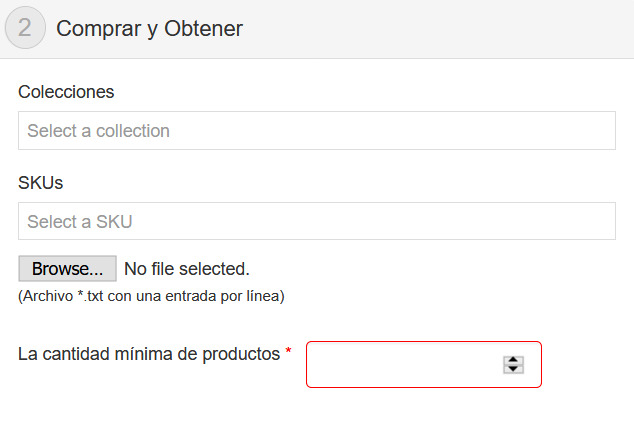 El descuento aplicado (flete gratis o regalo) debe definirse en los datos generales de la promoción. Luego, la tienda debe elegir las colecciones o SKUs a los que se aplicará. Finalmente, debe definir la cantidad mínima de ítems en el carrito para que la promoción funcione.
