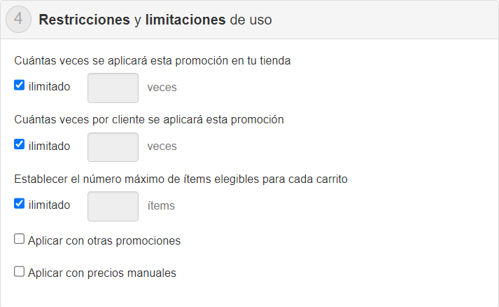 - Ítems por carrito: esta configuración limita la aplicación de la promoción a un número de ítems del carrito. Una vez alcanzado el límite, la promoción no se aplicará al resto del carrito. El sistema utiliza el precio como criterio de elección, por lo que los ítems con el precio más bajo serán los primeros en ser afectados.
