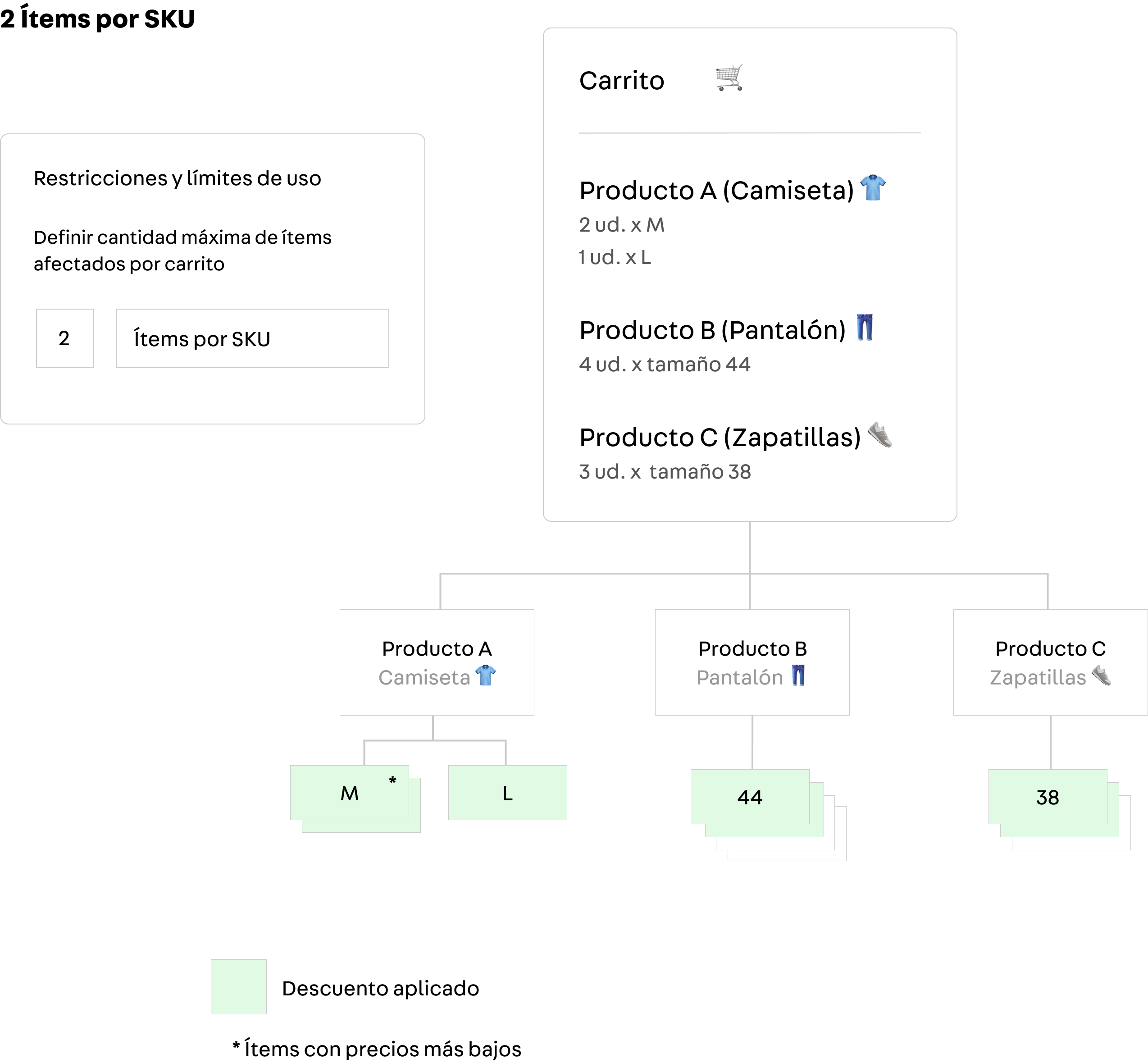 - Ítems por SKU: esta configuración limita la promoción a un número de unidades por cada SKU en el carrito. Como en el siguiente ejemplo, apenas dos unidades de cada SKU serán elegibles para la promoción. Como en el caso anterior, será el precio más bajo el que defina los ítems elegibles para la promoción.