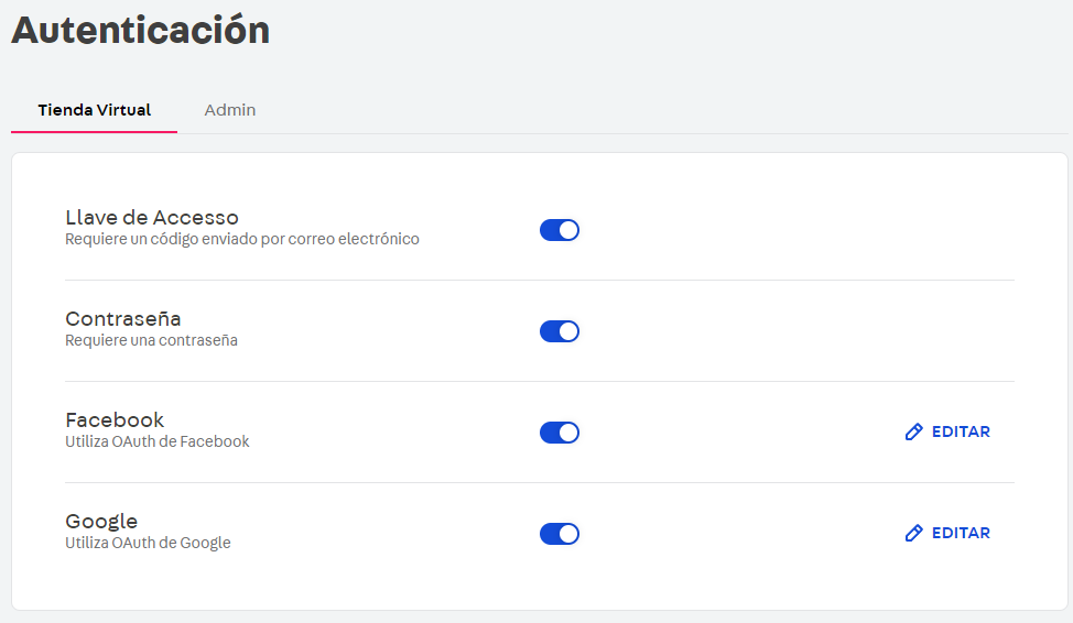 Se te redirigirá a la pestaña Tienda virtual, donde se muestran los métodos de inicio de sesión disponibles en tu tienda virtual. En esta pestaña puedes activar las opciones para el inicio de sesión de los clientes.