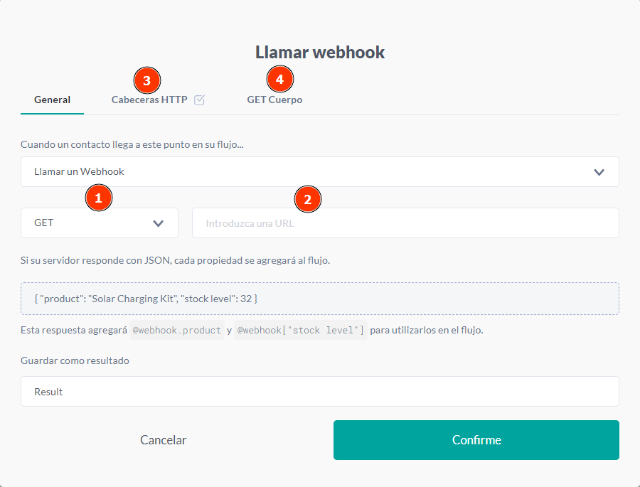 @webhook: El valor de esta variable es toda la respuesta de la última solicitud realizada.@webhook.results.cliente: Nombre del cliente devuelto por la API, en caso de que solo se devuelva un objeto.@webhook.results.0.cliente: Nombre del cliente devuelto por la API. Si la respuesta está en un array, es necesario especificar la posición deseada en el array, como 0, 1, 2, y así sucesivamente.