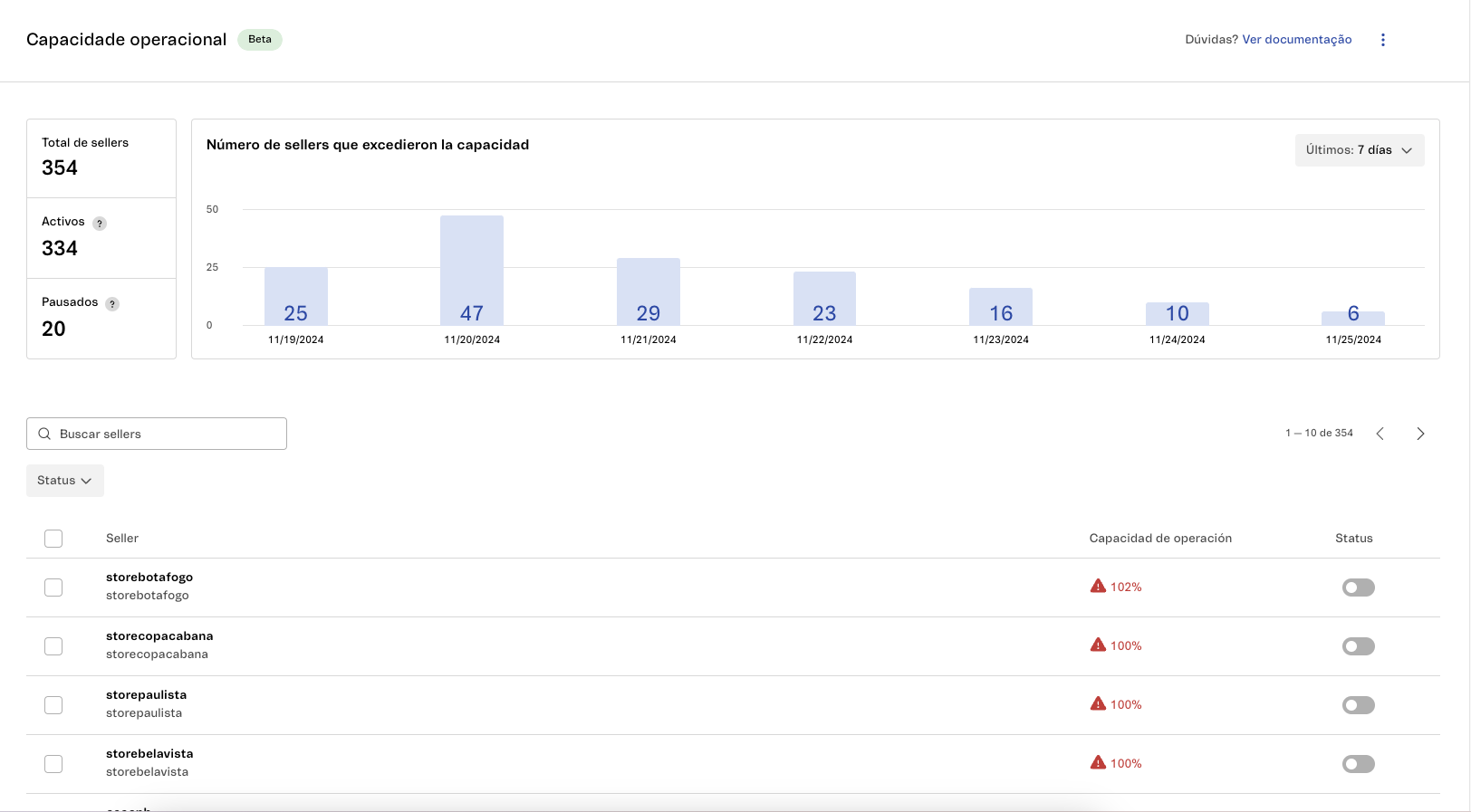 El módulo Capacidad operativa (Beta) te ayuda a gestionar la capacidad de los sellers para recibir y preparar pedidos de la tienda, optimizando así tu red logística. Puedes monitorear la distribución de pedidos entre los sellers y realizar acciones para mejorarla.