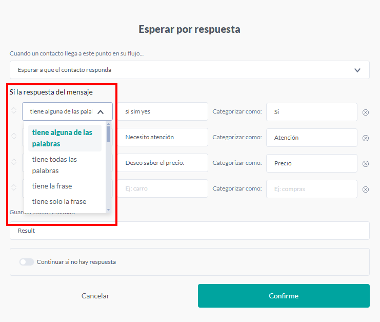 - Tiene alguna de las palabras : Si la respuesta/valor contiene cualquiera de las palabras seleccionadas, seguirá la ruta indicada. Todas las palabras deben estar separadas por un espacio.