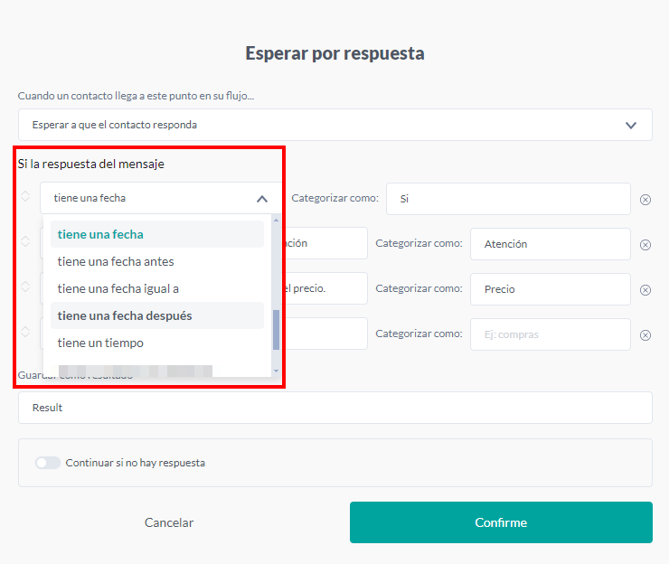 - Tiene una fecha : Si la respuesta/valor del contacto contiene una fecha, independientemente de cuál sea, seguirá la ruta indicada. La fecha debe tener un formato válido (ejemplo: DD/MM/AAAA).