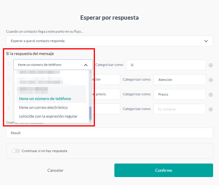 Aquí, todas las reglas de decisión analizan un campo del contacto. Solo necesitas seleccionar qué campo del contacto deseas verificar y luego definir las reglas correspondientes.